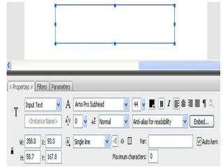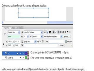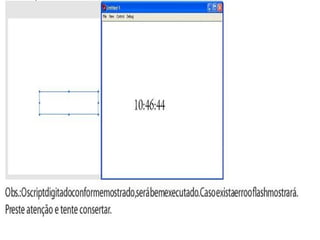 1) O documento apresenta um exemplo de código ActionScript para exibir a hora atual em um campo de texto dinâmico no Flash.