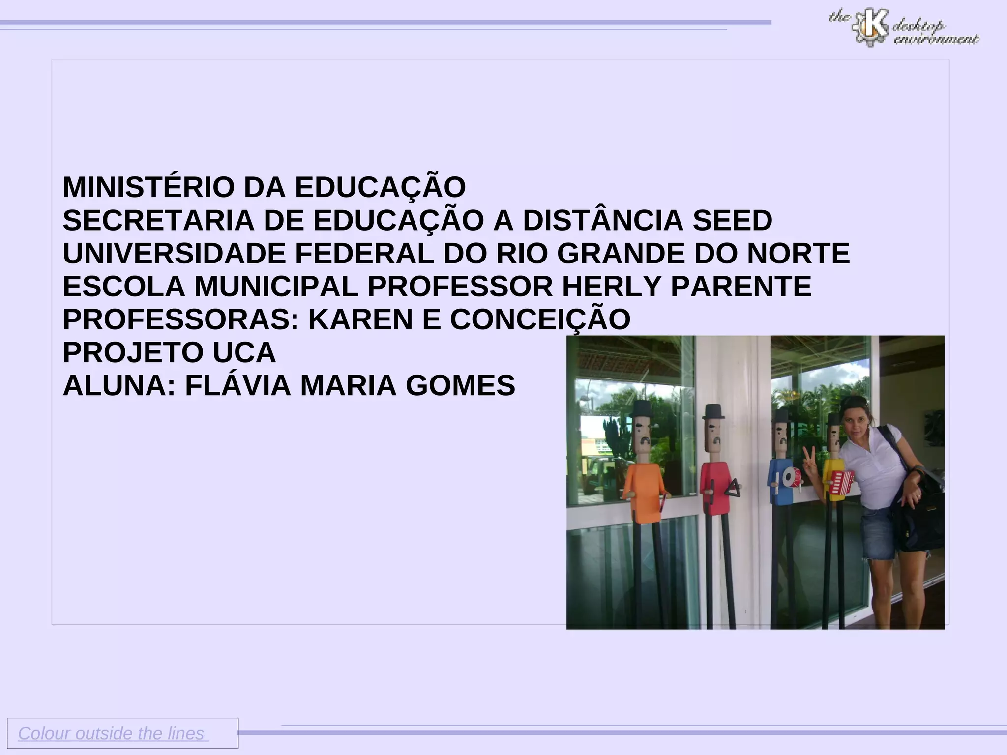 A aluna Flávia Maria Gomes descreveu suas impressões sobre o projeto UCA em 3 pontos. Ela apontou como dificuldades o manuseio do UCA, a familiarização com arquivos e funções. Como avanços, destacou que os encontros de formação foram proveitosos para orientação e segurança no uso do UCA. Sua sugestão foi de mais encontros de formação e um computador com tela maior.