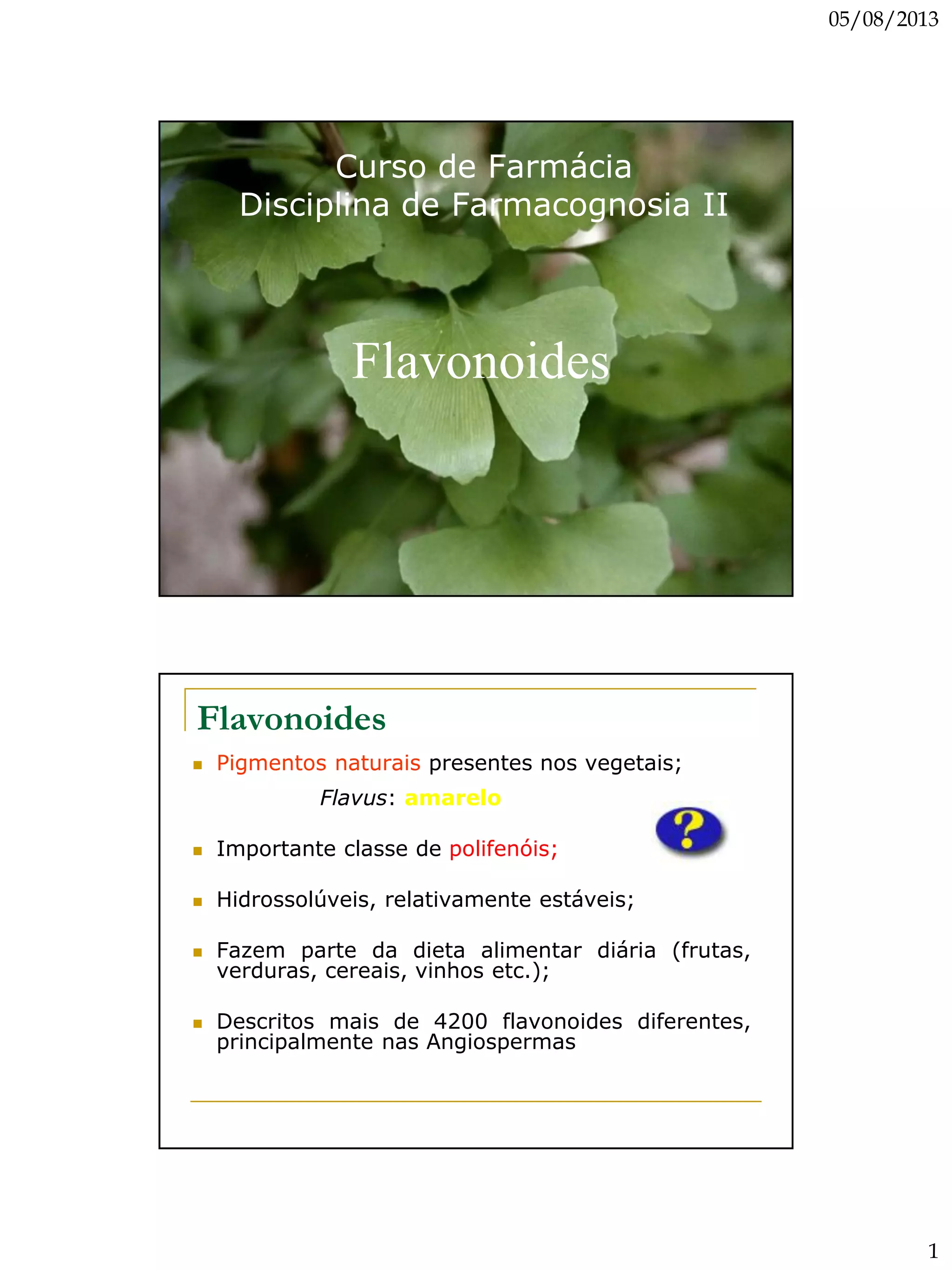 O documento discute flavonoides, compostos naturais encontrados em plantas. São polifenóis que protegem as plantas contra raios UV, insetos e fungos. A rutina, um flavonoide extraído da fava-danta, é usada no tratamento da fragilidade capilar. O Brasil é um importante exportador de rutina para a França.