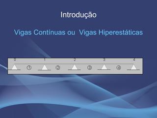 Este documento discute o método da equação dos três momentos e o método da flexibilidade para análise de vigas contínuas. Apresenta exemplos numéricos de cálculo de momentos fletores, reações de apoio e diagramas de esforços usando a equação dos três momentos. Também explica os conceitos teóricos e os passos para aplicação do método da flexibilidade.