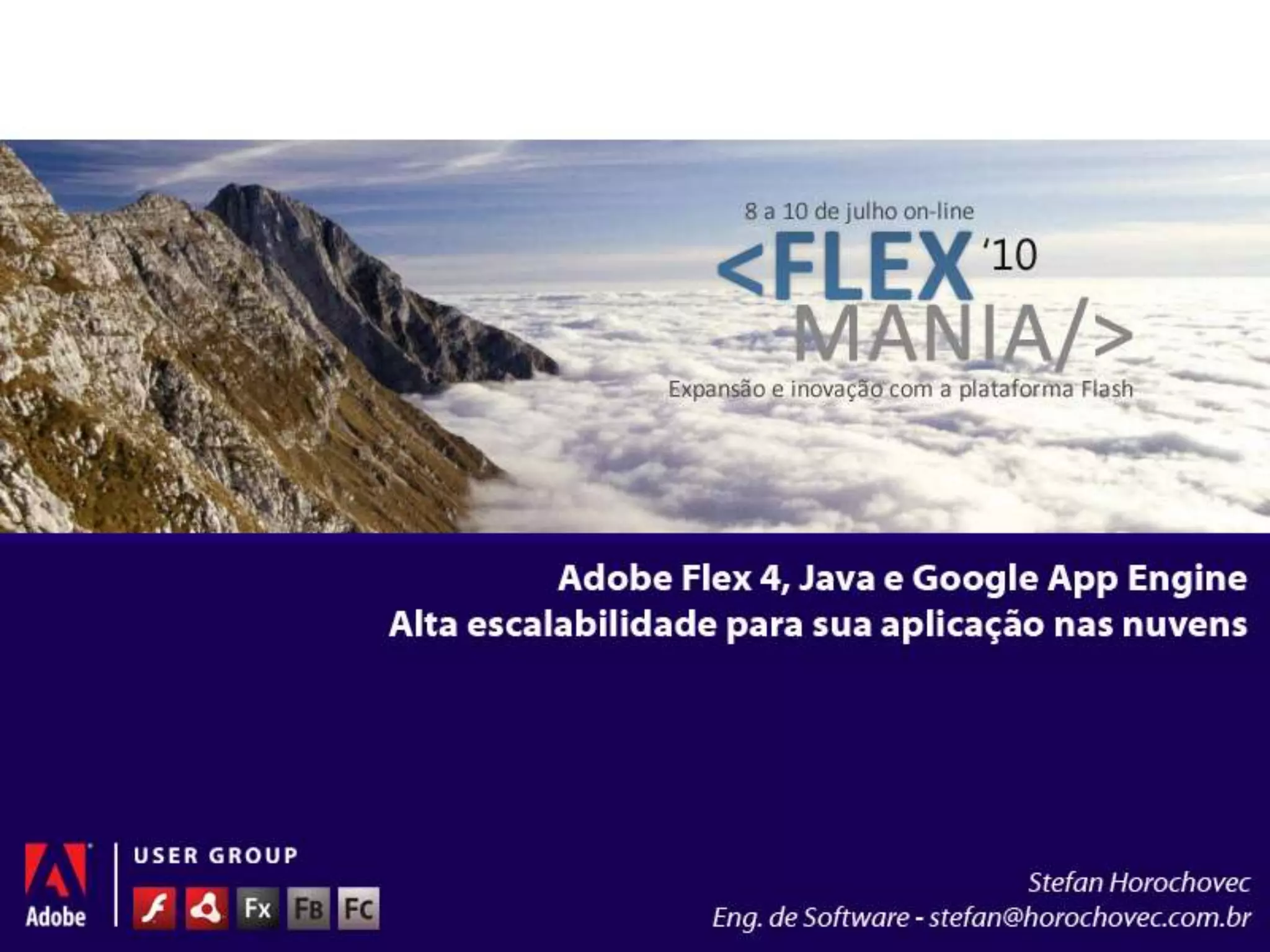 O documento apresenta Stefan Horochovec e discute Cloud Computing, Google AppEngine (GAE) e Adobe Flex. Ele resume o que é Cloud Computing, destacando os tipos Infrastructure as a Service (IaaS), Platform as a Service (PaaS) e Software as a Service (SaaS). Também discute características e vantagens/desvantagens do GAE para desenvolvimento em Java e integração com Adobe Flex.