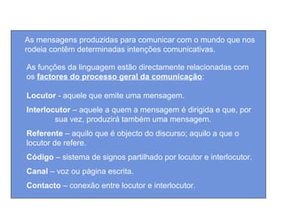 O documento discute as funções da linguagem, incluindo a função referencial para transmitir informações, a função emotiva para expressar emoções, e a função apelativa para influenciar o receptor. Ele também descreve outros tipos de funções como a fática para estabelecer comunicação, a metalinguística para verificar compreensão do código, e a poética para valor estético.