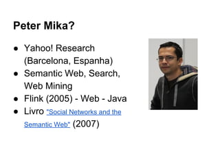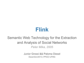 O documento discute a tecnologia Flink, de Peter Mika, aplicada à extração e análise de redes sociais através da web semântica. Utilizando o projeto FOAF, a pesquisa coletou dados de 608 pesquisadores em web semântica, incluindo publicações e interesses, resultando em uma análise ampla e de redes sociais. Os resultados destacam desafios na extração e representação de informações sociais, propondo a criação de uma ontologia social para melhorar a identificação de relacionamentos.