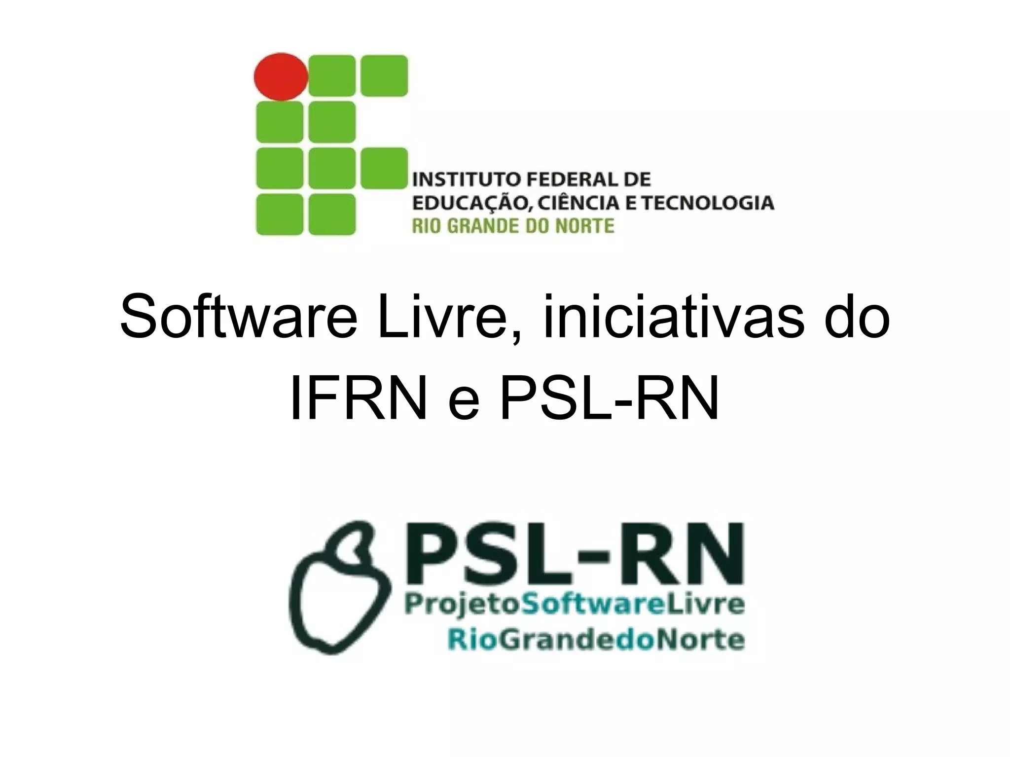 O documento discute o contexto e as atividades atuais e futuras do Instituto Federal do Rio Grande do Norte (IFRN) e do Grupo de Software Livre do Rio Grande do Norte (PSL-RN). O IFRN oferece cursos técnicos e tecnológicos relacionados à informática e usa software livre em projetos integradores. O PSL-RN é formado principalmente por alunos e professores do IFRN e promove eventos como o Dia Livre para difundir o software livre. Futuramente, IFRN e PSL-