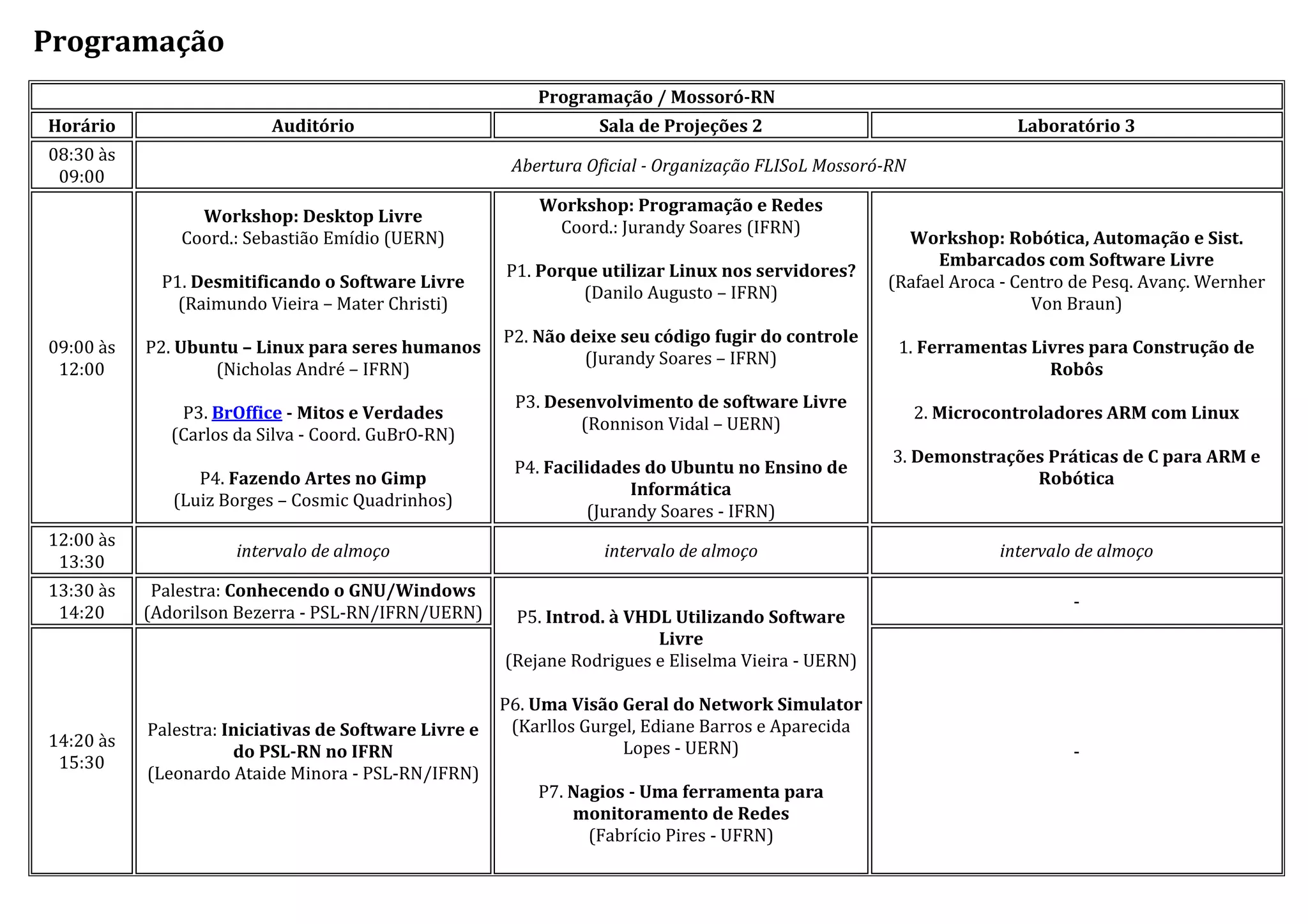 O documento descreve o programa do evento FLISOL Mossoró-RN, que inclui palestras, workshops e mini-cursos sobre software livre. Serão abordados tópicos como programação, redes, robótica, sistemas embarcados e desenvolvimento web. Haverá também distribuição de softwares livres e coleta de doações de alimentos. O evento é uma iniciativa do PSL-RN em parceria com IFRN e UERN.