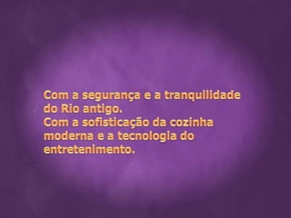 O documento discute a tendência dos moradores e visitantes do Rio de Janeiro buscarem experiências que proporcionem qualidade de vida e momentos prazerosos, mesmo estando dispostos a pagar mais. Também aborda a ideia do Floating Lounge, um barco com vista privilegiada para a paisagem carioca e shows de luzes, como uma opção noturna que resgata a calmaria do passado da cidade.