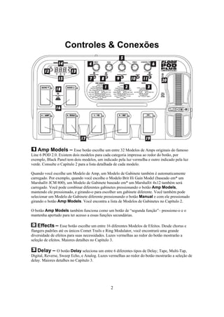 2. Inclui uma lista de 32 modelos de amplificadores e 16 modelos de gabinetes incluídos, além de descrever cada controle do Floor POD Plus.