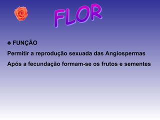As flores têm funções reprodutivas, com partes masculinas (androceu) e femininas (gineceu). A reprodução sexuada envolve a transferência de pólen das anteras para o estigma, onde ocorre a fecundação formando frutos e sementes. As angiospermas também se reproduzem assexuadamente por propagação vegetativa.