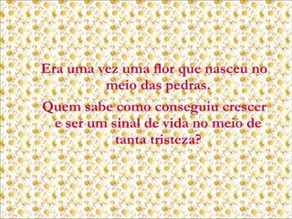 A história conta a metáfora de uma flor que nasceu entre pedras e como diferentes pessoas interagiram com ela: uma jovem a cortou e levou para a igreja mas ela morreu, um homem a admirou mas não a cortou e ela morreu em uma tempestade, e uma criança decidiu cuidar dela todos os dias até transformar o local em um jardim, cultivando uma amizade.