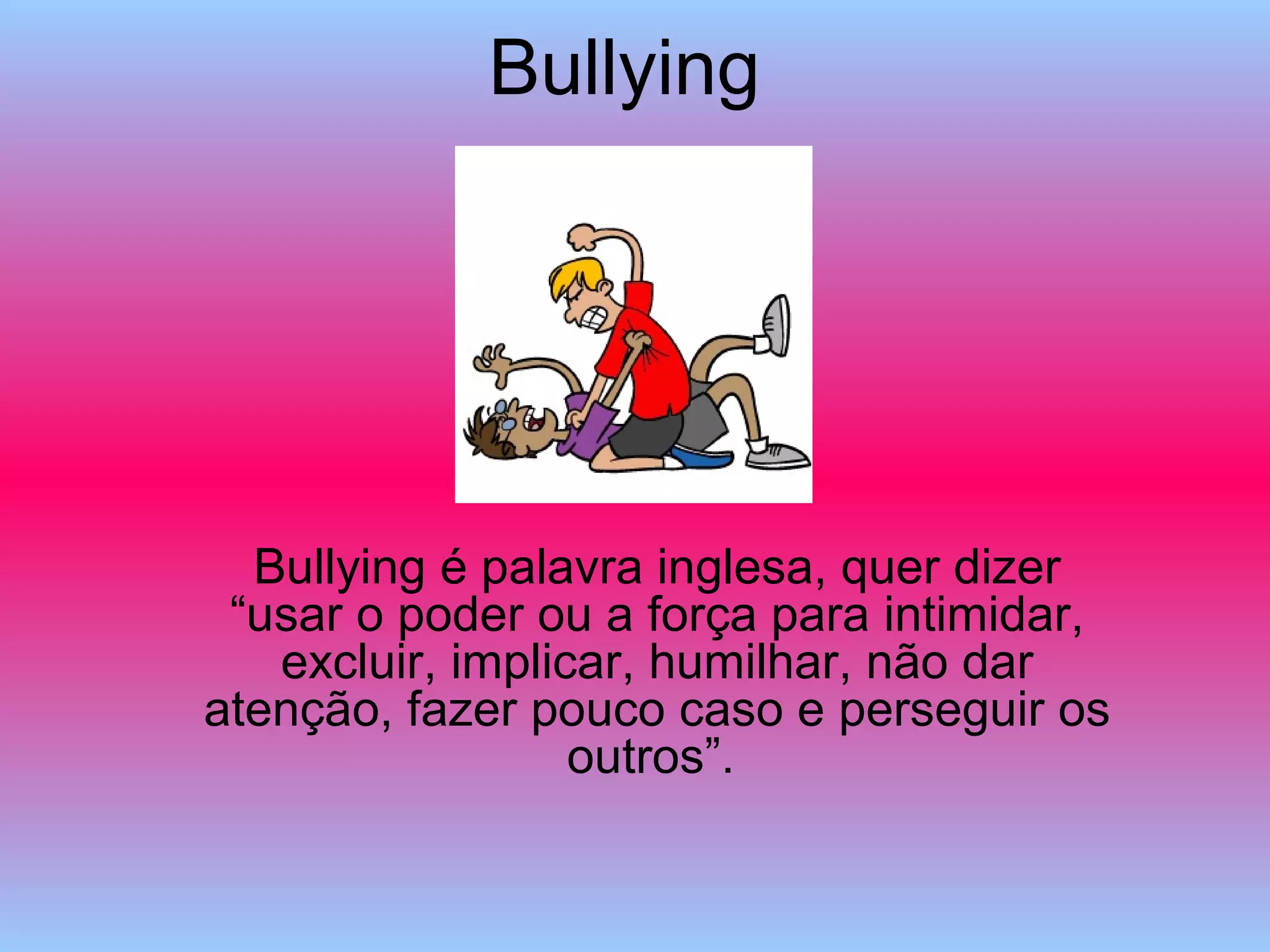 Bullying é um termo em inglês que significa intimidar, excluir, implicar, humilhar ou perseguir outras pessoas. O bullying ocorre principalmente nas escolas e locais de trabalho e pode envolver tanto agressores quanto vítimas. O bullying compreende atitudes agressivas e intencionais contra outros que ocorrem frequentemente sem motivo aparente.
