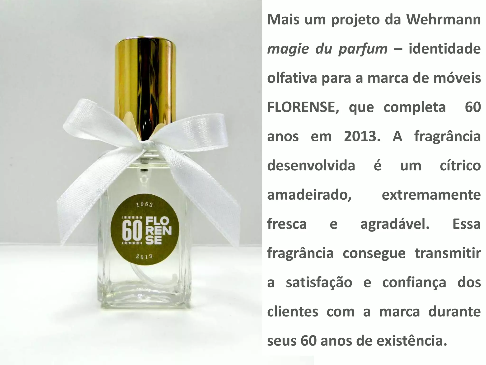 A Wehrmann desenvolveu uma fragrância cítrica e amadeirada para comemorar os 60 anos da marca de móveis FLORENSE. A essência fresca e agradável tem como objetivo transmitir a satisfação e confiança que os clientes sentem pela marca ao longo de suas seis décadas de existência.
