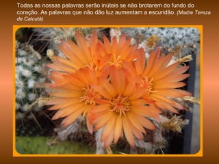 Este documento contém citações de várias autoras femininas sobre amor, compaixão e esperança. Madre Teresa de Calcutá enfatiza a importância de palavras vindas do coração e do amor aos próximos. Indira Gandhi fala sobre viver uma vida difícil como privilégio e transformar a vida em obra de arte. Helen Keller destaca que maravilhas são reveladas na medida da nossa capacidade de percebê-las.