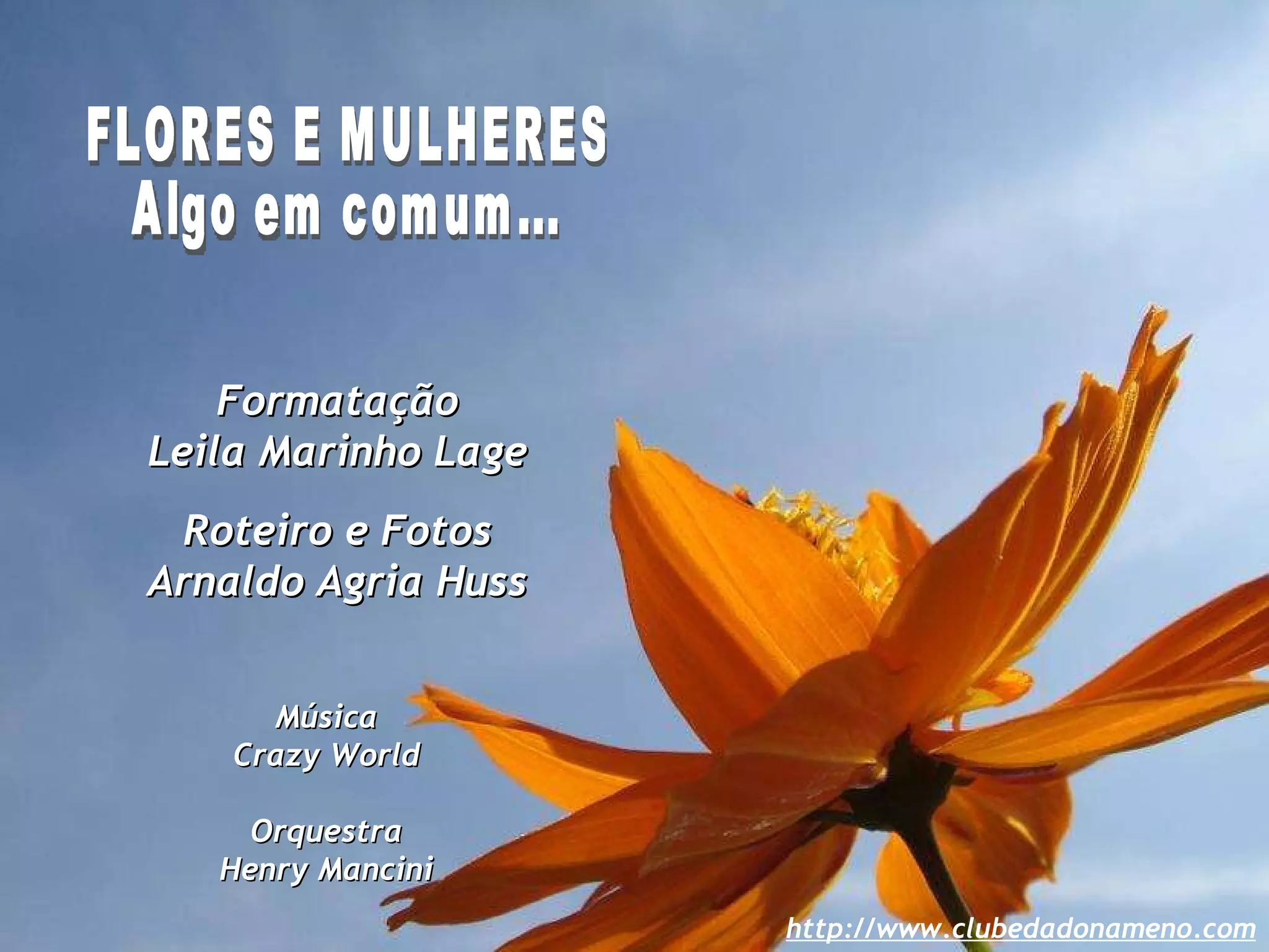 FLORES E MULHERESAlgo em comum... Formatação Leila Marinho Lage Roteiro e Fotos Arnaldo Agria Huss Música Crazy World Orquestra Henry Mancini http://www.clubedadonameno.com