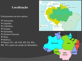 A Floresta Amazônica se estende por nove países, possui clima equatorial quente e úmido, e abriga a maior biodiversidade do planeta, com centenas de espécies de plantas e animais, incluindo árvores de até 60m, palmeiras, orquídeas e mais de 1800 aves.