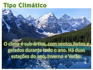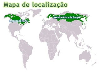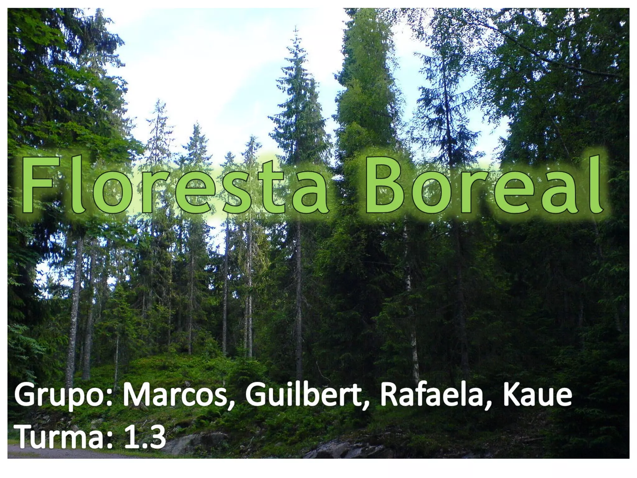 O documento descreve as características da floresta boreal conhecida como Taiga, incluindo as árvores de porte mediano resistentes à neve, a formação de iglus naturais para abrigo de animais e a presença de mamíferos e aves migratórias. Também menciona as atividades econômicas de exploração madeireira e depósitos nucleares, bem como os riscos de degradação devido à indústria, incêndios e pragas de insetos.
