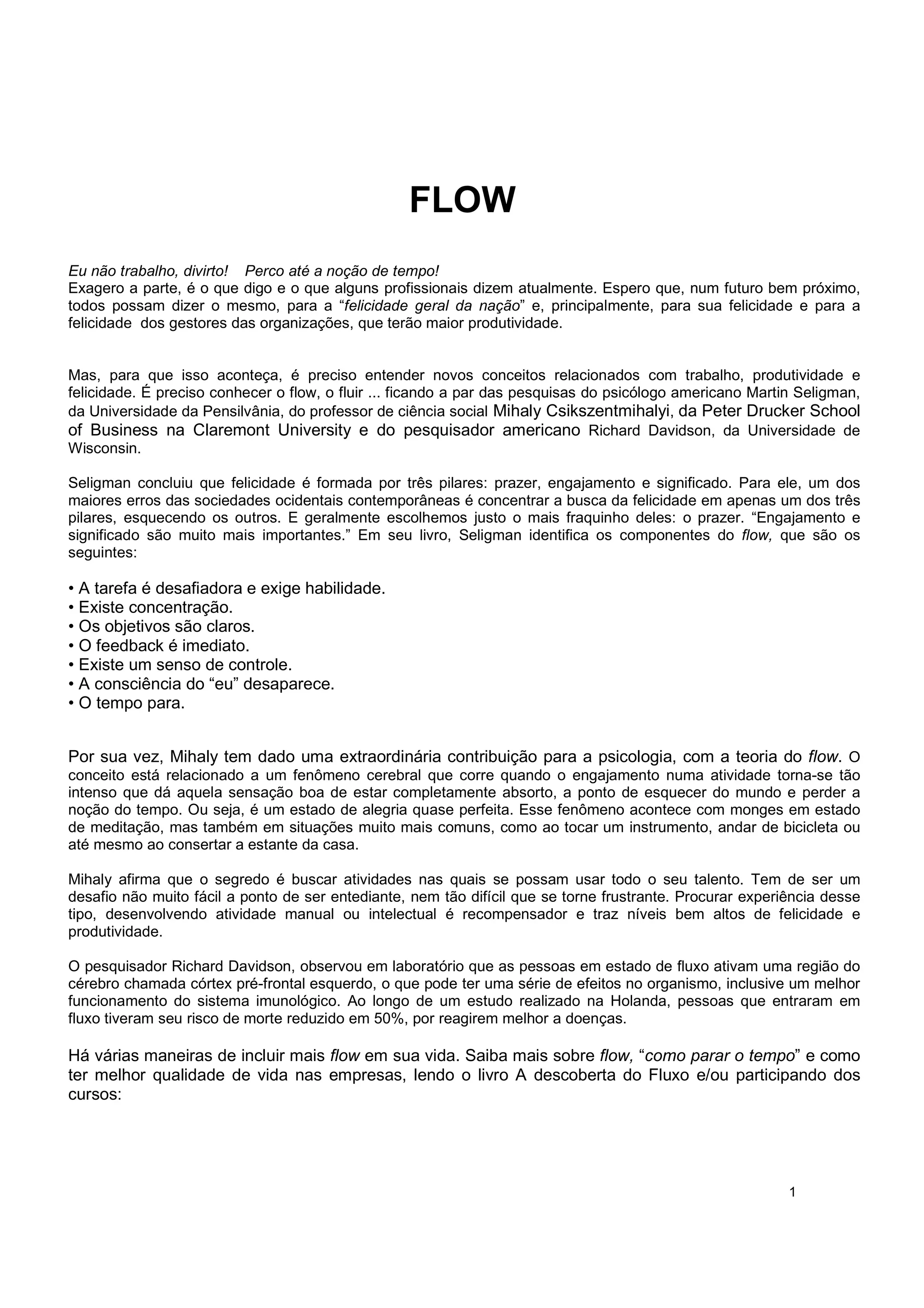 O documento discute a teoria do "fluxo" e como atingir estados mentais de completo foco e absorção que levam à felicidade. Aponta que a felicidade vem de engajamento e significado, não apenas prazer. Experiências de fluxo ocorrem quando se usa plenamente habilidades em desafios apropriados, levando a sentimentos de alegria e produtividade aumentada. Cursos são oferecidos para aplicar esses conceitos de fluxo e felicidade no trabalho.