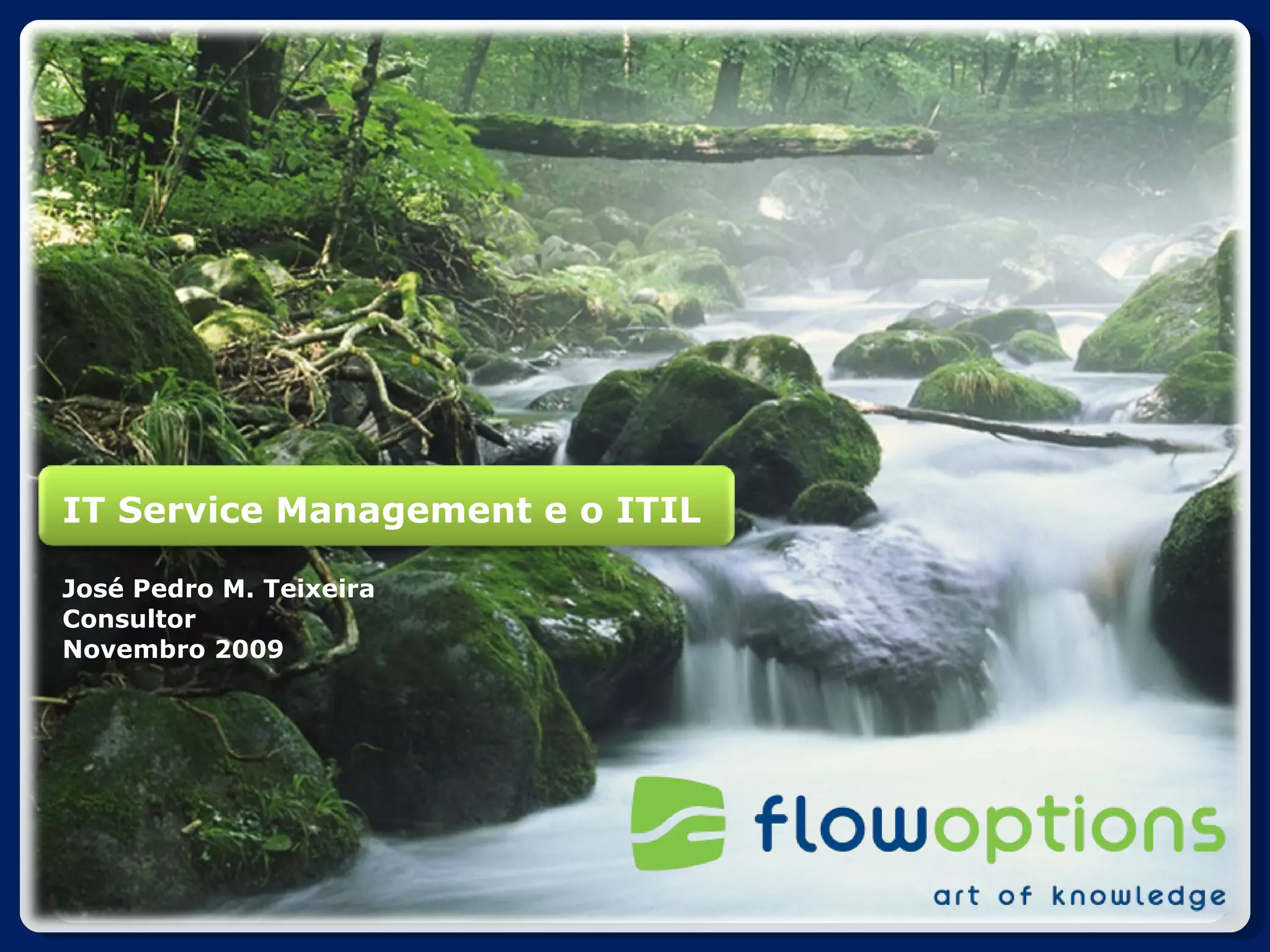 O documento discute a importância da gestão de serviços de TI (ITSM) e do framework ITIL. Apresenta os principais pontos do ITIL, incluindo sua história, processos, ciclo de vida e benefícios do ITSM como alinhamento das TI com os negócios, redução de custos e garantia da qualidade dos serviços.