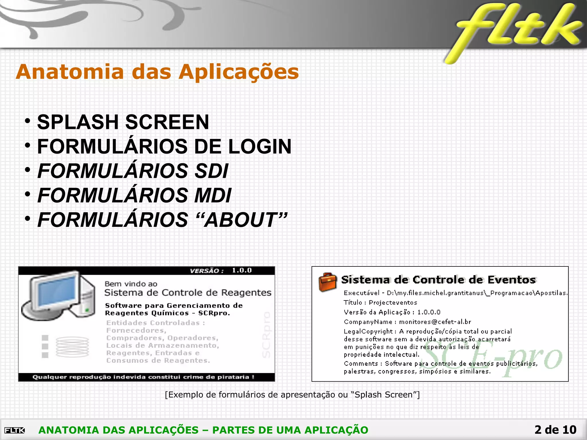 O documento é uma introdução ao Fast Light Toolkit (FLTK), abordando aspectos da anatomia das aplicações, como splash screens e formulários de autenticação. Discute a importância de elementos visuais e controles de acesso nas aplicações, além de apresentar diferentes tipos de formulários, como SDI e MDI. Também contém uma citação de William Shakespeare sobre potencial e autoconhecimento.