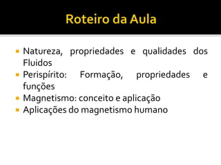 Natureza, propriedadese qualidades dos Fluidos  Perispírito: Formação, propriedades e funções  Magnetismo: conceito e aplicação  Aplicações do magnetismo humano