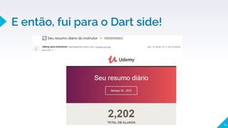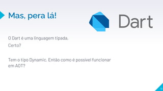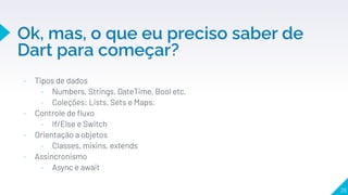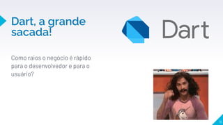 O documento discute a linguagem Dart e o framework Flutter. Inicialmente, o autor ficou confuso com a sintaxe de Dart, mas percebeu que a Google não escolheria algo sem motivo. Ele aprendeu primeiro o framework Flutter e foi testando código. Depois descobriu que o Flutter atualiza sem recarregar tudo, chamado de Hot Reload. Isso é possível devido ao JIT e AOT. O documento também lista vantagens de Dart, como não precisar de múltiplas linguagens e não usar marcação como XML.
