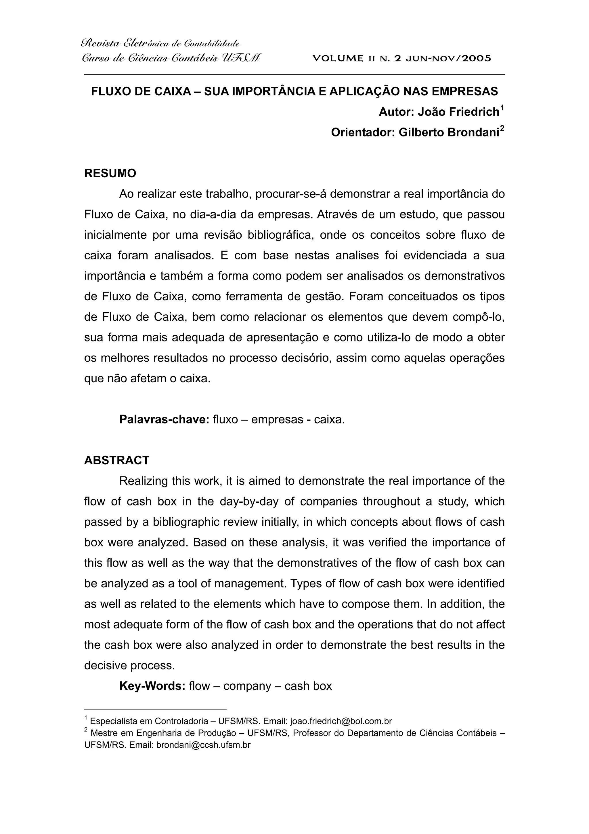Este documento discute a importância do fluxo de caixa para as empresas e fornece diretrizes sobre como elaborar e estruturar demonstrativos de fluxo de caixa. Explica que o fluxo de caixa projeta entradas e saídas de caixa para planejamento financeiro e ajuda a evitar problemas de liquidez. Também descreve como o fluxo de caixa histórico analisa o desempenho passado para melhorar decisões futuras.
