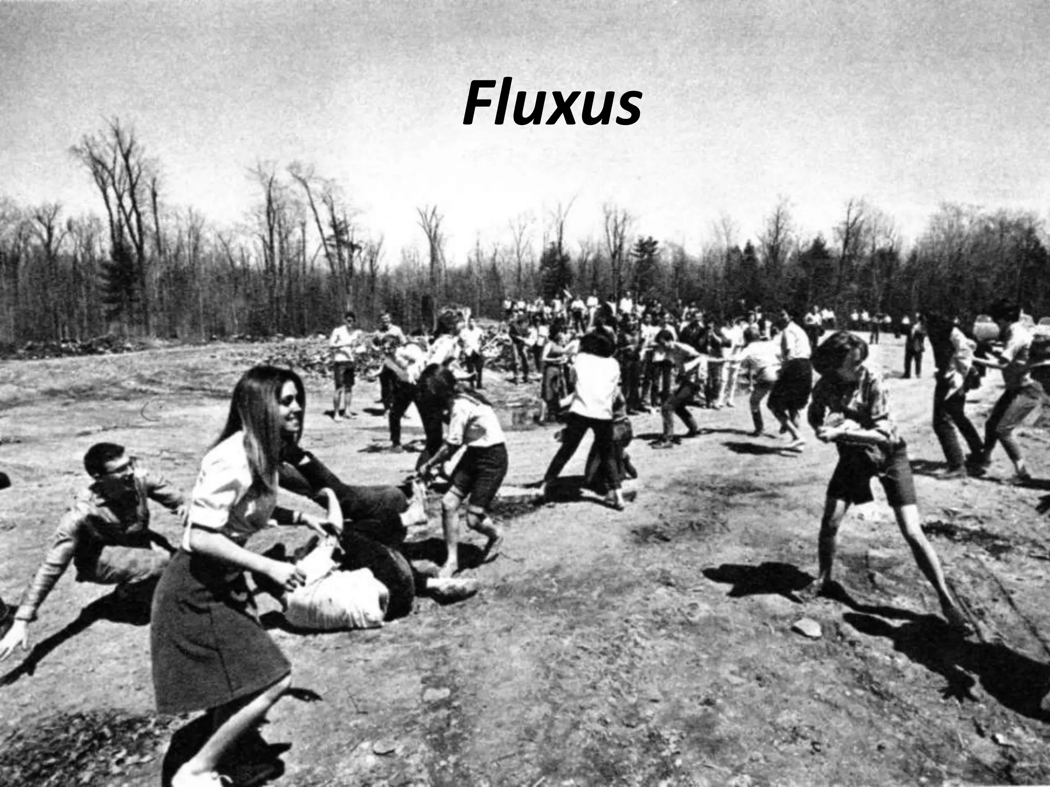 O Fluxus foi um movimento artístico das décadas de 1960-1970 que valorizava a criação coletiva através de performances e happenings envolvendo diferentes artes. Liderado por George Manciunas, o Fluxus era contra a noção tradicional de arte objetual, preferindo ações improvisadas e efêmeras que envolviam a participação do público. Artistas como Joseph Beuys e Wolf Vostell estiveram ligados a este movimento.
