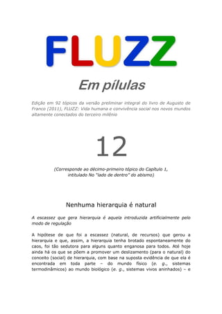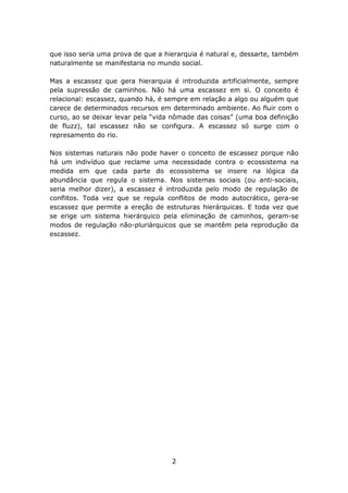 Este documento discute como a hierarquia e a escassez não são naturais, mas sim introduzidas artificialmente pelos modos de regulação social. A escassez só surge quando os fluxos naturais são reprimidos, cortando caminhos, e quando os conflitos são regulados de forma autoritária em vez de pluriárquica. Assim, a hierarquia emerge para manter esse modo de regulação baseado na escassez artificialmente criada, em um ciclo de reprodução mútua.