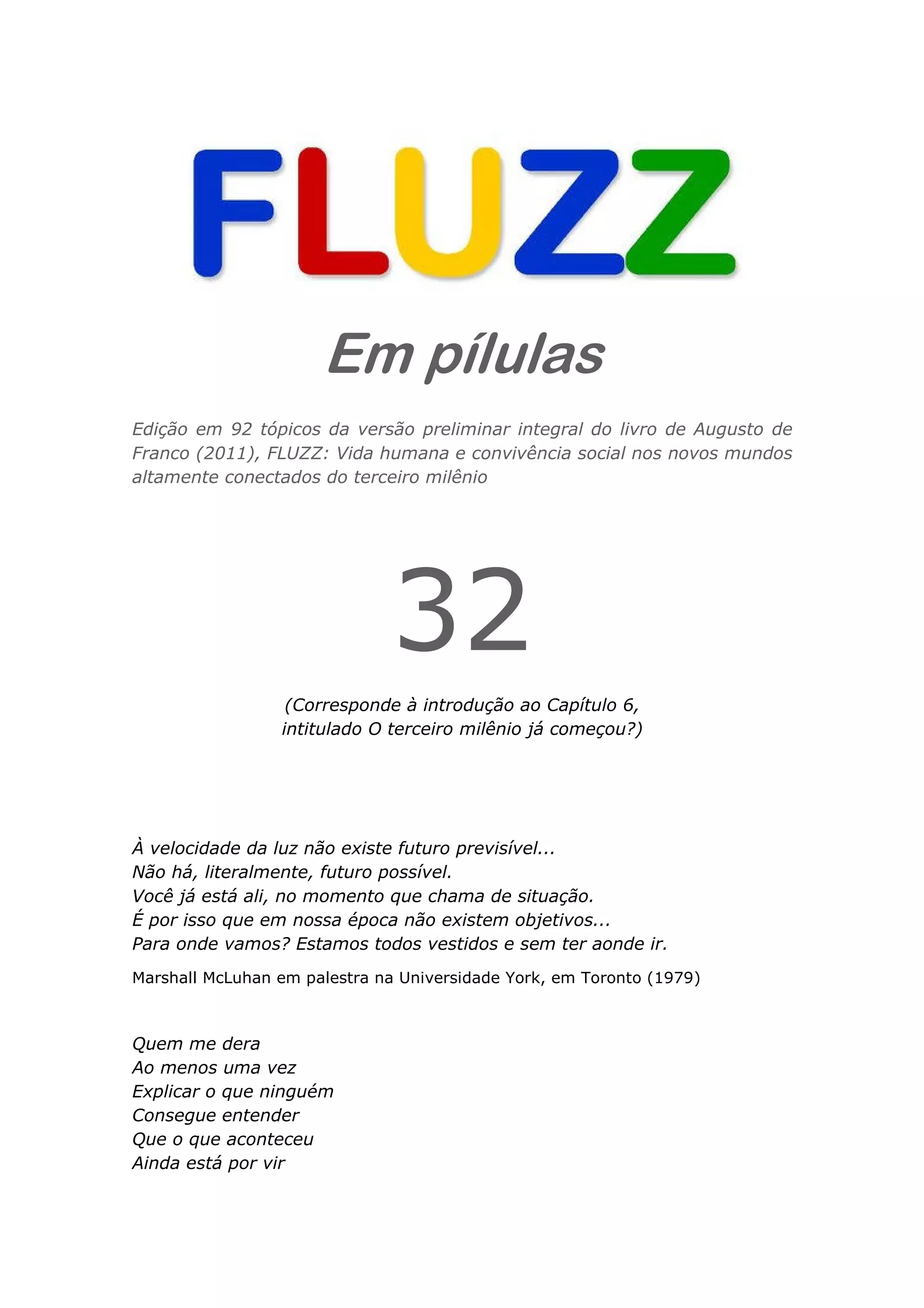 Este documento discute como o futuro não pode mais ser visto como algo único e previsível devido à existência de múltiplos mundos altamente conectados no terceiro milênio. Ideias progressistas do século 20 como "pensar globalmente e agir localmente" já não se aplicam mais quando não há um mundo único. Citações de McLuhan, Russo e Ugarte ilustram como o futuro fragmentou-se em múltiplos futuros possíveis dependendo do mundo em que se vive.