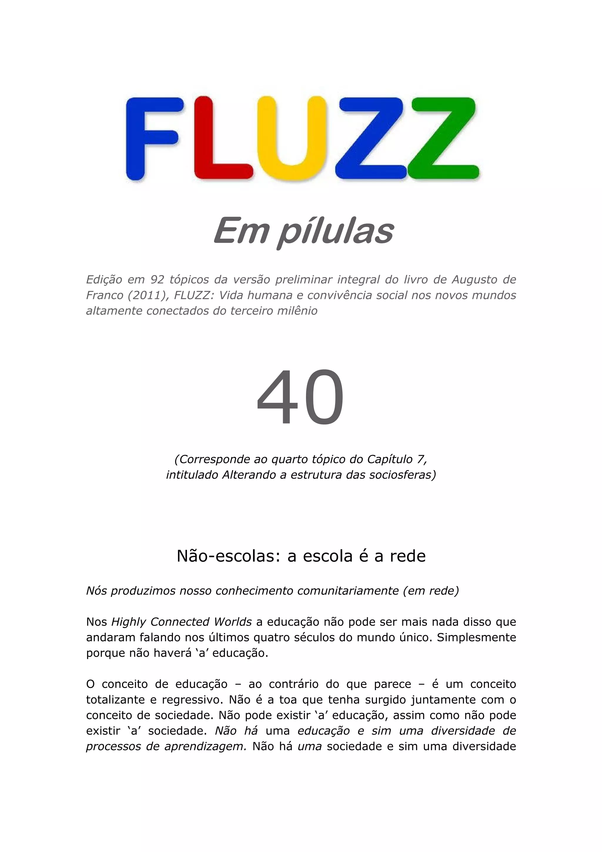 Neste documento, o autor argumenta que na era da alta conectividade não haverá mais "a educação", mas sim uma diversidade de processos de aprendizagem. Ele afirma que as redes sociais irão substituir as escolas tradicionais, onde todos serão autodidatas e aprenderão uns com os outros de forma colaborativa. Essas novas "sociedades-escola" serão comunidades educadoras formadas nas redes sociais, onde o conhecimento é produzido coletivamente.