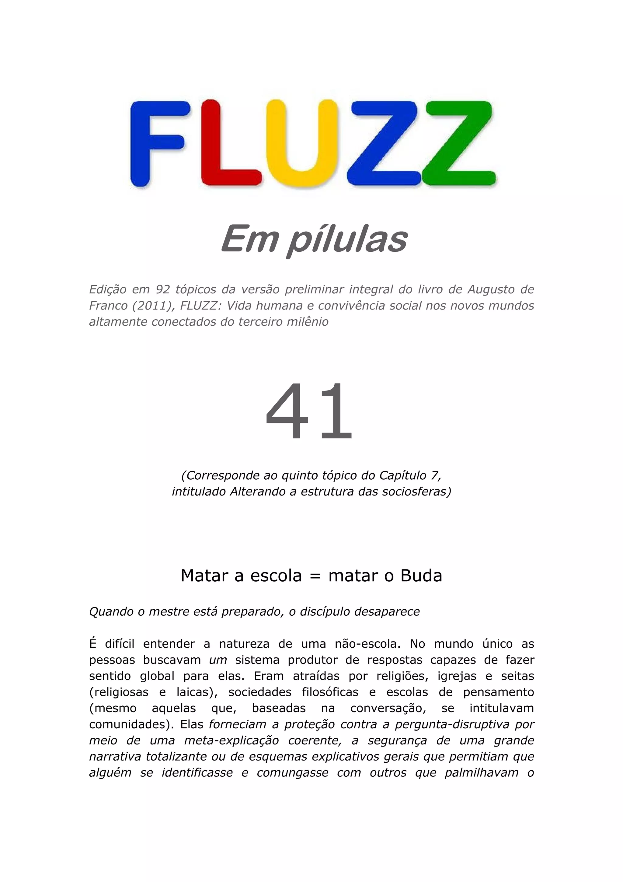 Este documento discute a natureza das "não-escolas" nos mundos altamente conectados do terceiro milênio. Argumenta-se que não é mais possível construir grandes narrativas ou sistemas de pensamento totalizantes, e que as comunidades de aprendizagem devem se abrir para interações fluidas em vez de se estruturarem como escolas tradicionais. Também defende que é necessário "matar o Buda" ao desfazer a autoridade dos fundadores e permitir que novas interpretações surjam de forma descentralizada na rede.