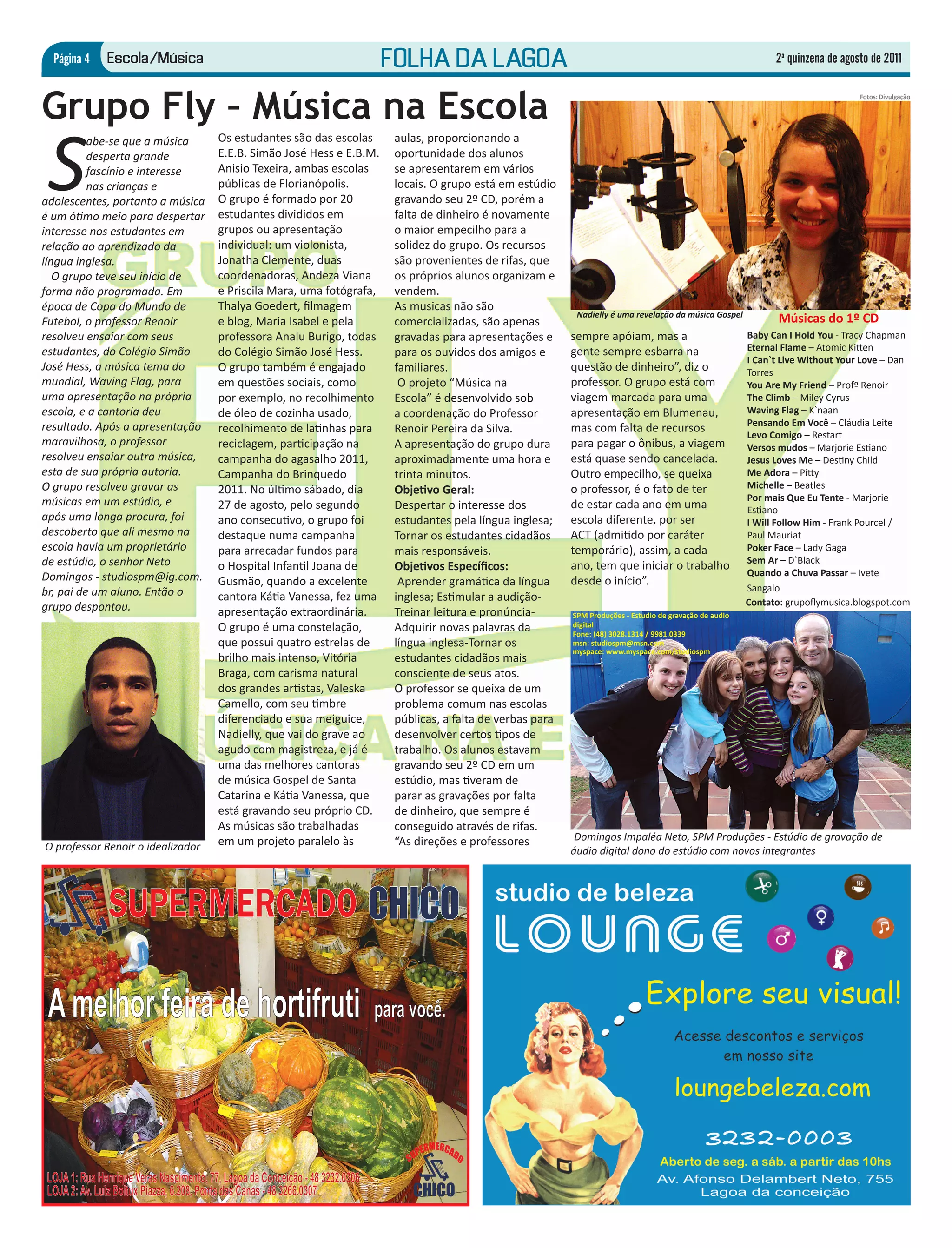 O grupo musical "Fly" foi formado por alunos de duas escolas públicas em Florianópolis para despertar o interesse dos estudantes pela língua inglesa através da música. O grupo grava músicas em inglês e se apresenta em diversos locais para arrecadar fundos para projetos sociais. No entanto, falta de recursos financeiros tem dificultado a gravação do segundo CD do grupo e a realização de uma viagem planejada.
