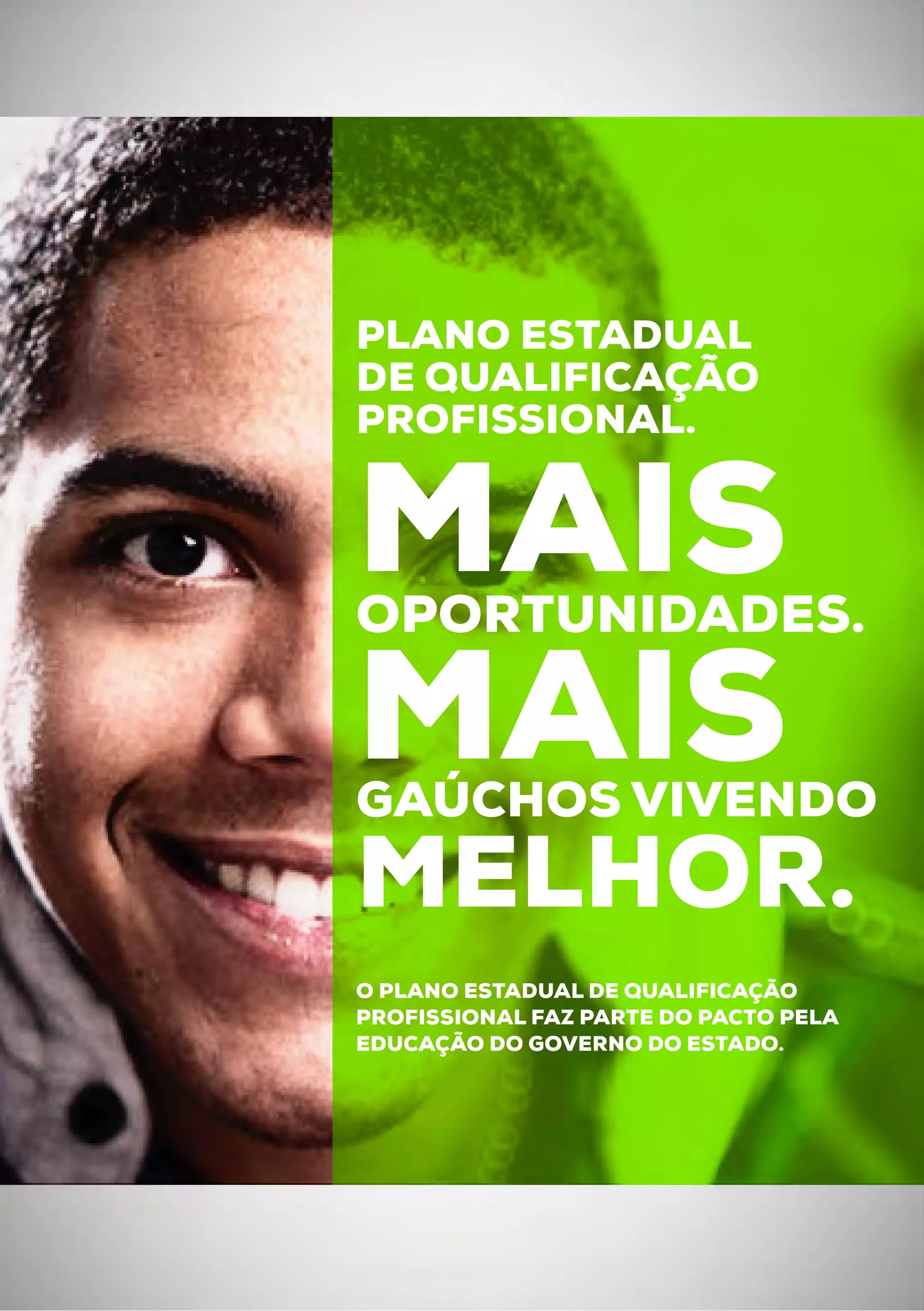 O documento descreve o Plano Estadual de Qualificação Profissional do governo do Rio Grande do Sul, que oferece cursos gratuitos em construção civil, indústria e serviços para mais de 40 mil pessoas, com o objetivo de oferecer mais oportunidades e melhorar a qualidade de vida dos gaúchos.