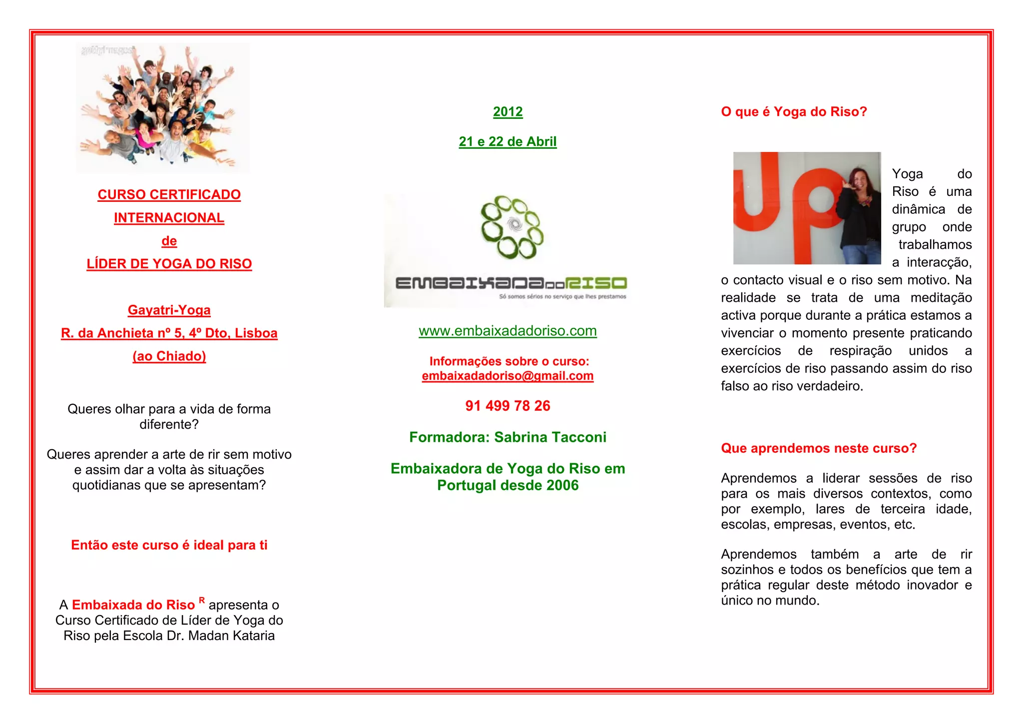 Este documento anuncia um curso de Yoga do Riso que será realizado nos dias 21 e 22 de Abril. O Yoga do Riso é uma técnica de grupo que trabalha a interação, o contato visual e o riso sem motivo através de exercícios de respiração e riso. O curso ensina a liderar sessões de riso para diferentes contextos e aprender a arte de rir sozinho, trazendo benefícios para a saúde.