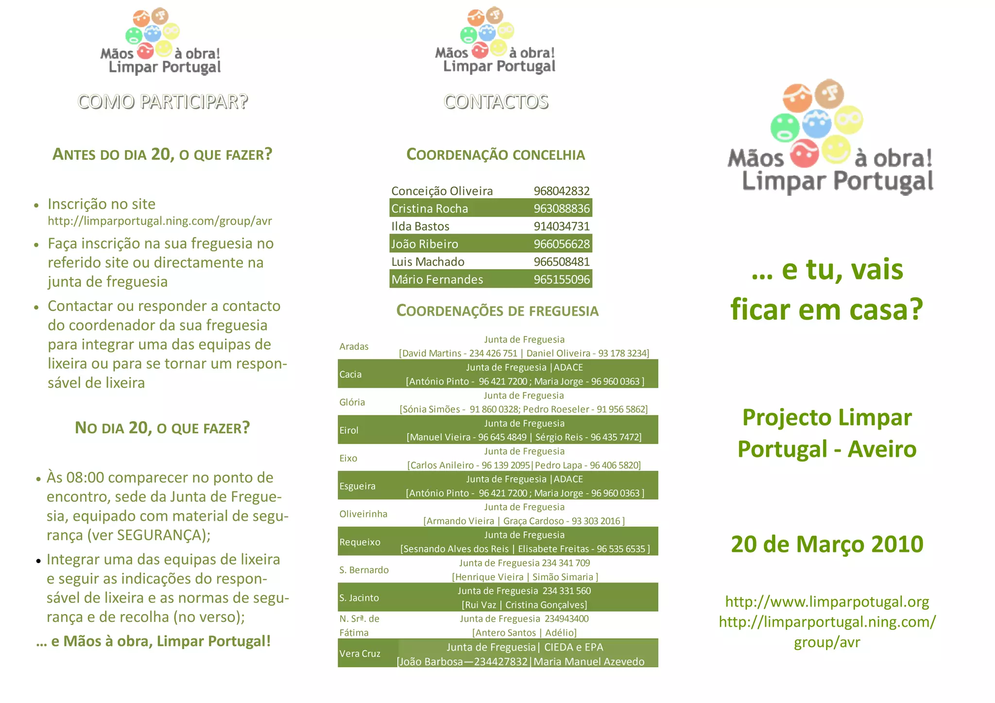 Este documento fornece instruções sobre como participar no projeto "Limpar Portugal" na cidade de Aveiro, em Portugal. Inclui detalhes sobre como se inscrever, onde se reunir no dia da limpeza, e informações de contato para as coordenações de diferentes freguesias. Também fornece orientações sobre segurança e separação de resíduos.