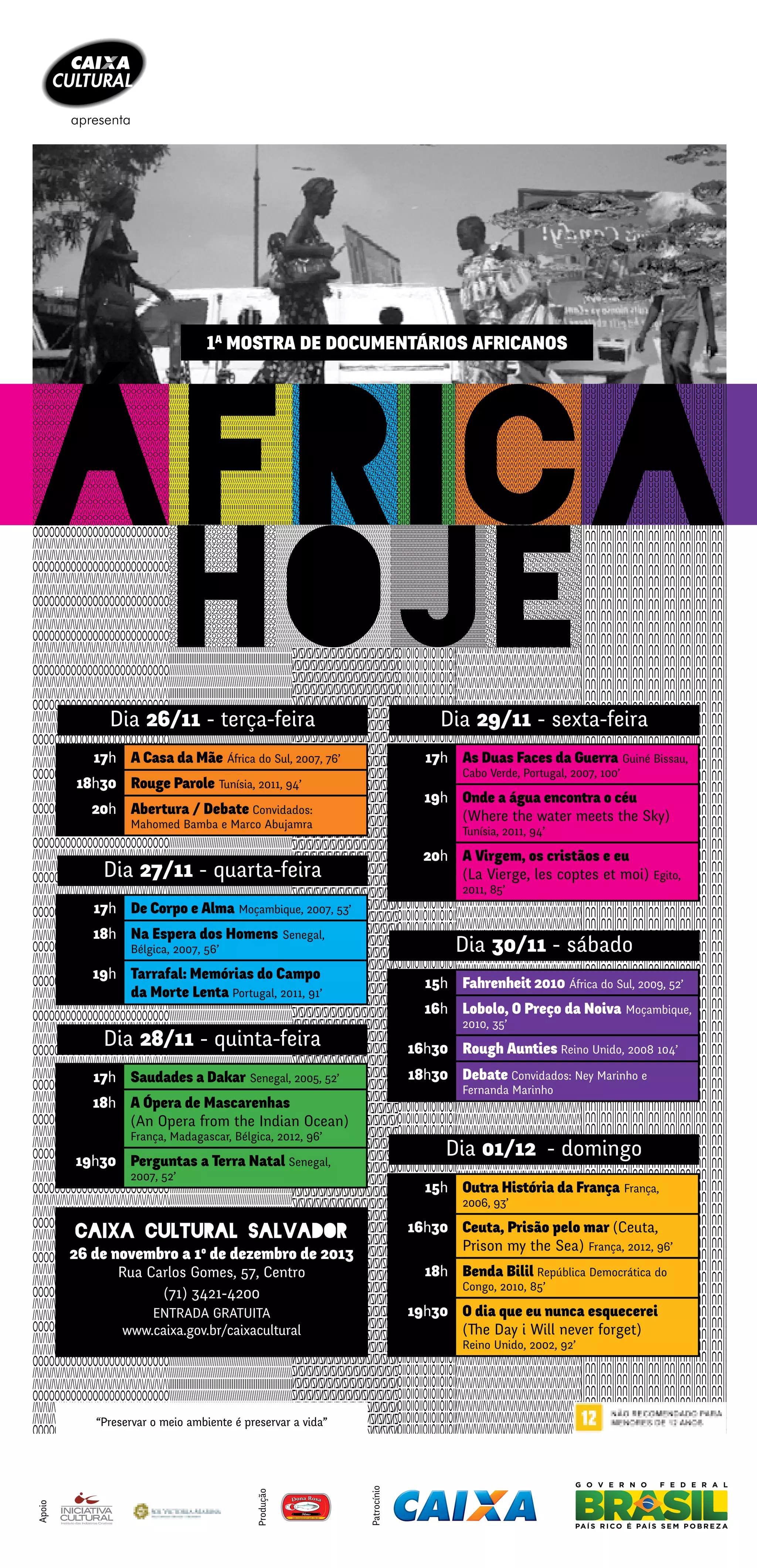 Uma mostra de documentários africanos será realizada de 26 de novembro a 1 de dezembro na Caixa Cultural em Salvador, com filmes de países como África do Sul, Guiné-Bissau, Cabo Verde, Tunísia, Moçambique, Senegal e Portugal, incluindo debates com convidados. Os filmes abordam temas como a história, cultura e realidade socioeconômica de vários países africanos.