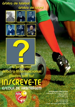 O anúncio convida árbitros para se inscreverem gratuitamente para se tornarem árbitros internacionais através da Associação de Futebol de Leiria, fornecendo o endereço e números de contato.