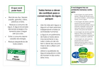 O documento discute a importância da reciclagem e da conservação da água. Ele enfatiza que (1) a água é essencial para a vida e todos temos o dever de contribuir para sua conservação, (2) a reciclagem traz benefícios ambientais como redução no desmatamento e na poluição, e criação de empregos, e (3) pequenas ações como reciclar, reduzir o consumo de água e energia podem fazer a diferença.