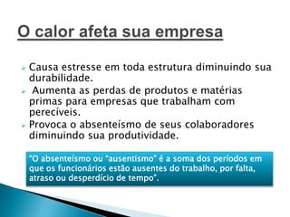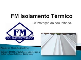 O documento descreve os serviços de isolamento térmico oferecidos pela empresa FM Isolamento para telhados comerciais e industriais, que ajuda a reduzir os custos de refrigeração e aumentar a produtividade ao manter os ambientes mais frescos. O processo envolve a aplicação de um revestimento acrílico importado que reflete até 90% da radiação solar, mantendo as telhas até 30°C mais frias. A empresa já tratou mais de 1 milhão de metros quadrados de telhados em 18 estados brasileiros.