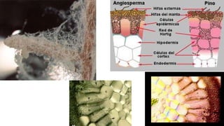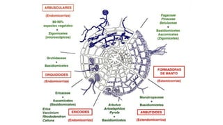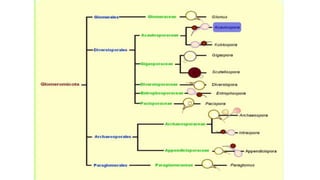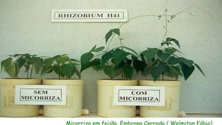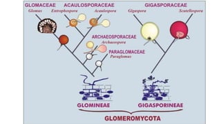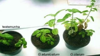 O documento descreve os fungos micorrízicos arbusculares, incluindo sua longa história evolutiva, os tipos de micorrizas e suas características. Os fungos micorrízicos arbusculares são endomicorrízicos, associados simbioticamente à maioria das plantas para captar fósforo do solo, e contribuem para o desenvolvimento das plantas e a agregação do solo.