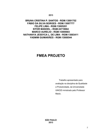 [1] O documento apresenta um projeto FMEA (Análise de Modo e Efeito de Falha) para uma cafeteira elétrica. [2] A equipe identificou possíveis falhas em componentes-chave da cafeteira e recomendou ações para minimizar os riscos. [3] Após as análises e ações corretivas, o projeto da cafeteira foi aprimorado para aumentar sua confiabilidade e reduzir chances de falhas.