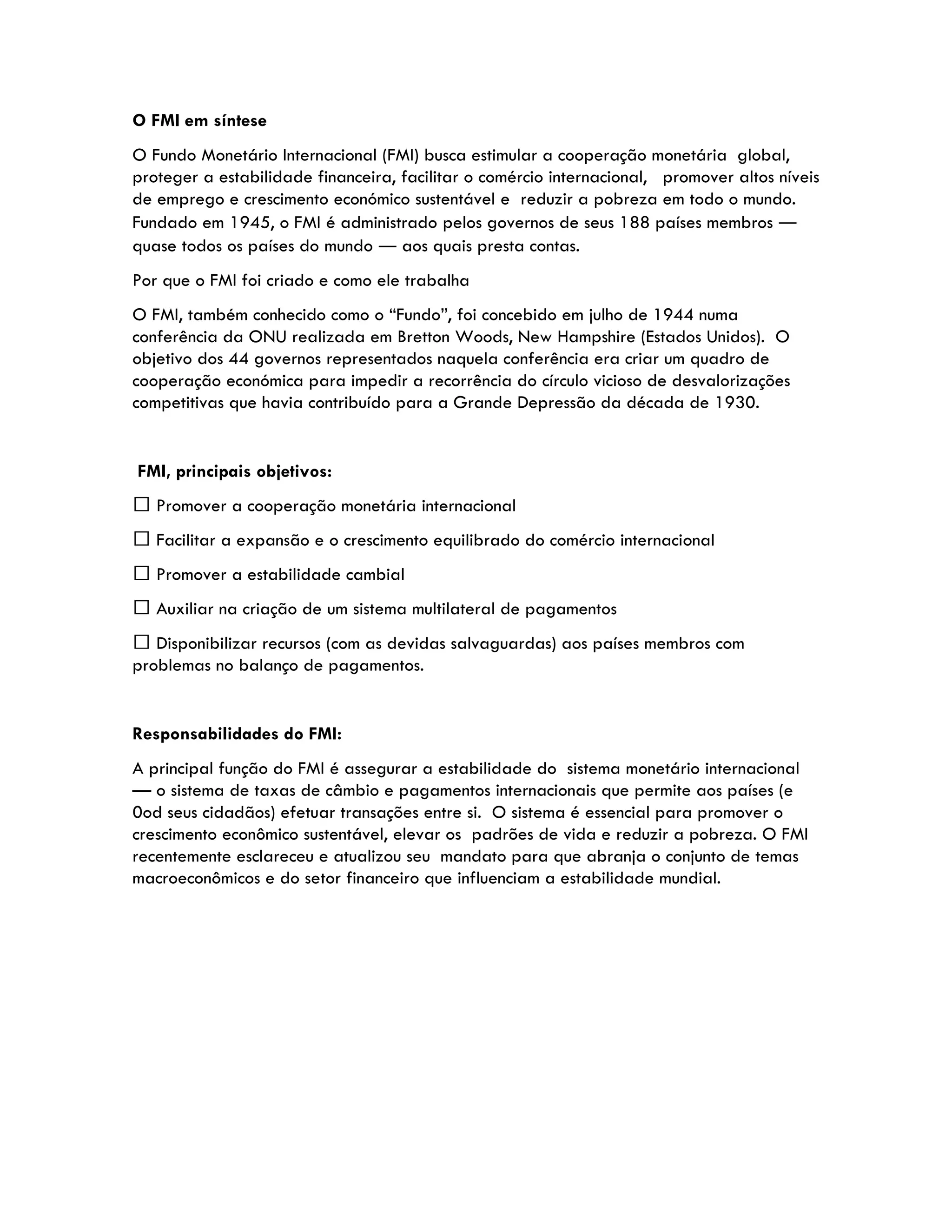 O FMI busca promover a cooperação monetária global e financeira entre países, proteger a estabilidade financeira internacional e facilitar o comércio global para promover o crescimento econômico e reduzir a pobreza. Fundado em 1945 por 44 nações, o FMI é administrado por 188 países membros e trabalha para assegurar a estabilidade do sistema monetário internacional.