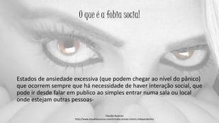 A fobia social é caracterizada por estados excessivos de ansiedade e pânico em situações sociais, levando à evitação destas. Pode ser generalizada ou específica. Os sintomas incluem aceleração cardíaca, respiração rápida e sudação excessiva. Em casos graves, pode levar ao isolamento total e depressão. No entanto, é possível superar a fobia social.