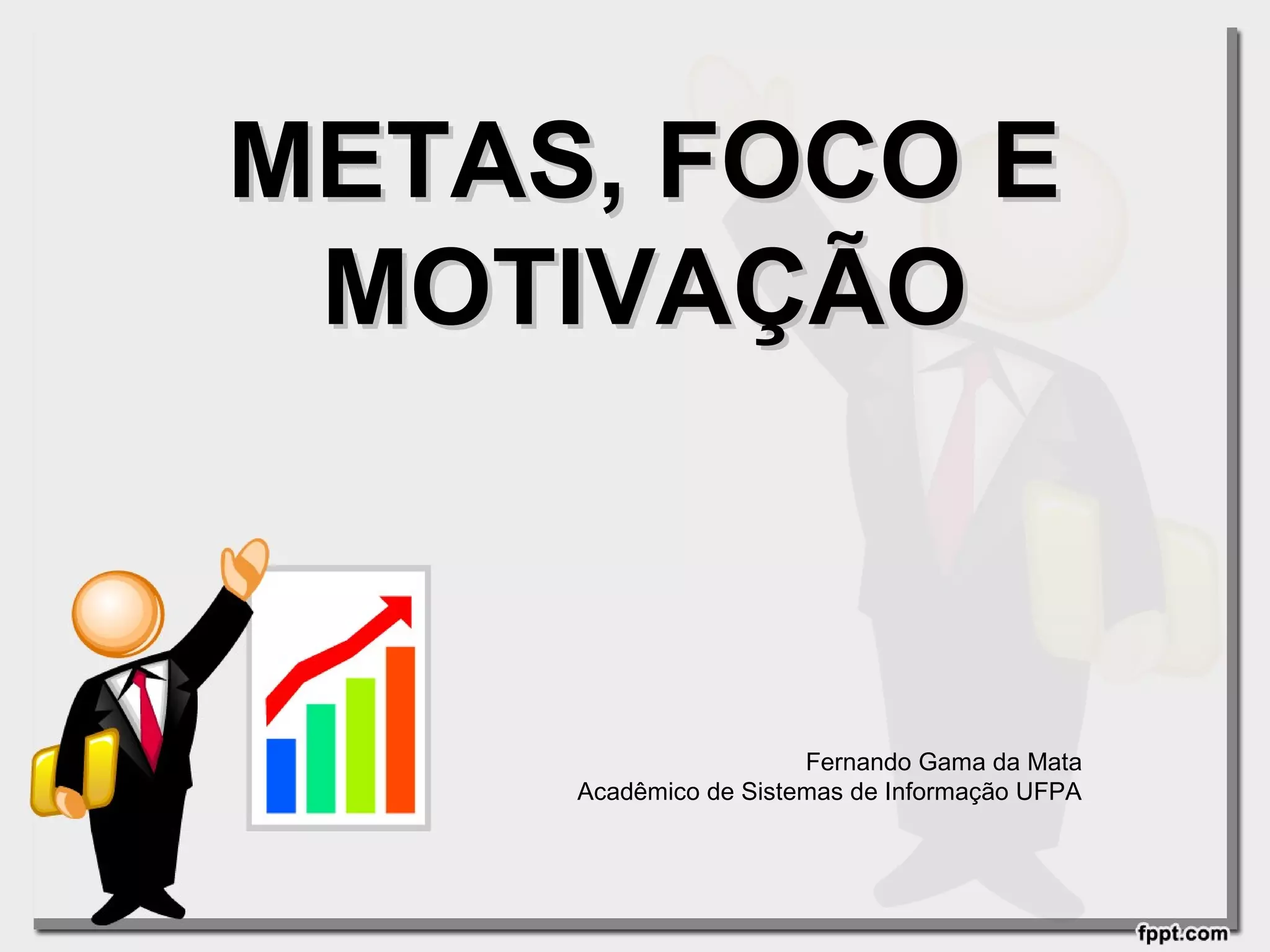 O documento discute metas, foco e motivação. Ele explica que as metas devem ser atingíveis, ter data limite e um plano de ação, e que o foco é ter um objetivo determinado a alcançar sem desviar. A motivação é definida como o impulso para a ação.