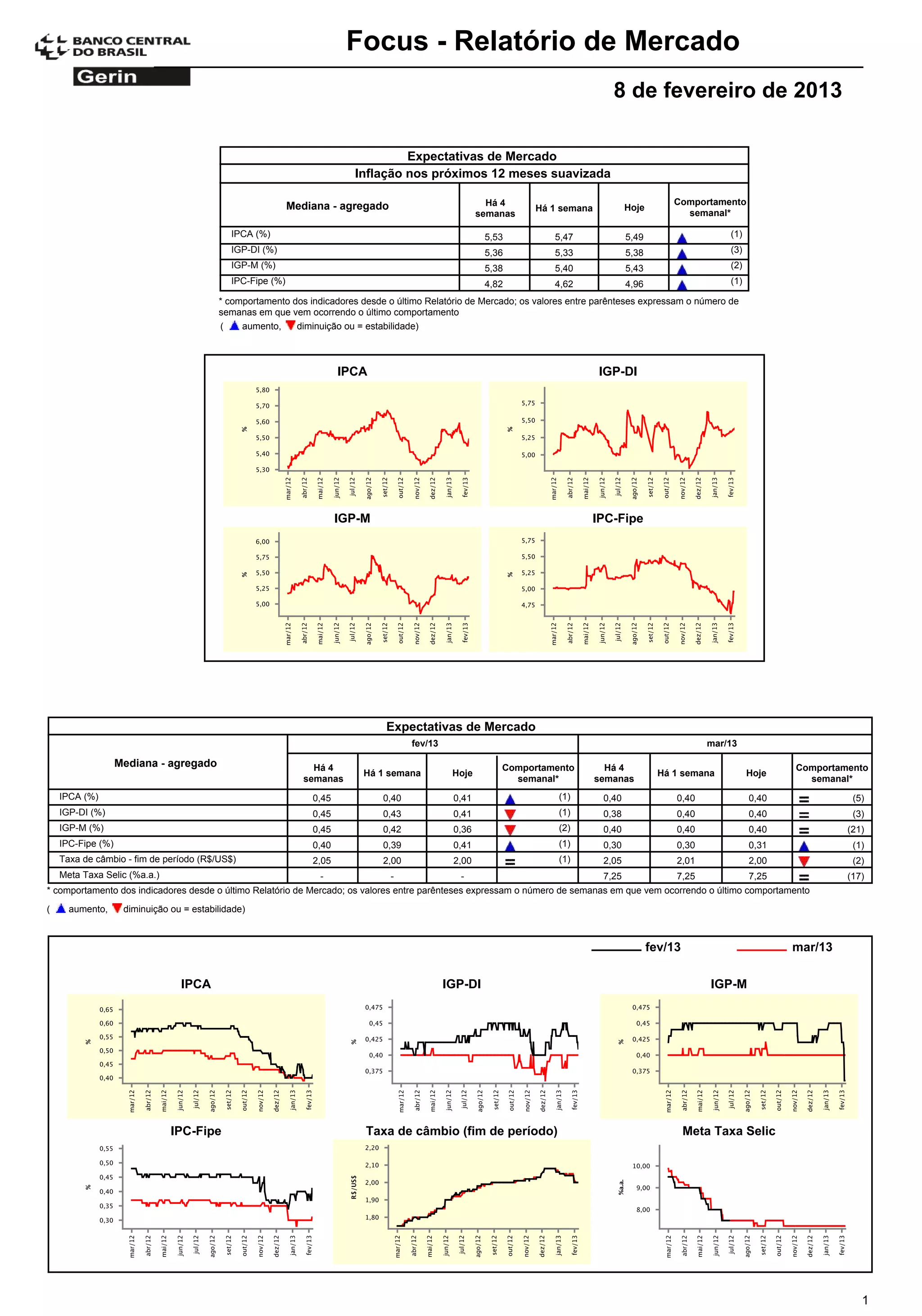O relatório resume as expectativas de mercado para os principais indicadores econômicos brasileiros nos próximos 12 meses e em 2013-2014. A inflação mediana prevista é de cerca de 5,5% para os próximos 12 meses e em 2013. As taxas de câmbio e juros também são previstas para se manterem estáveis.
