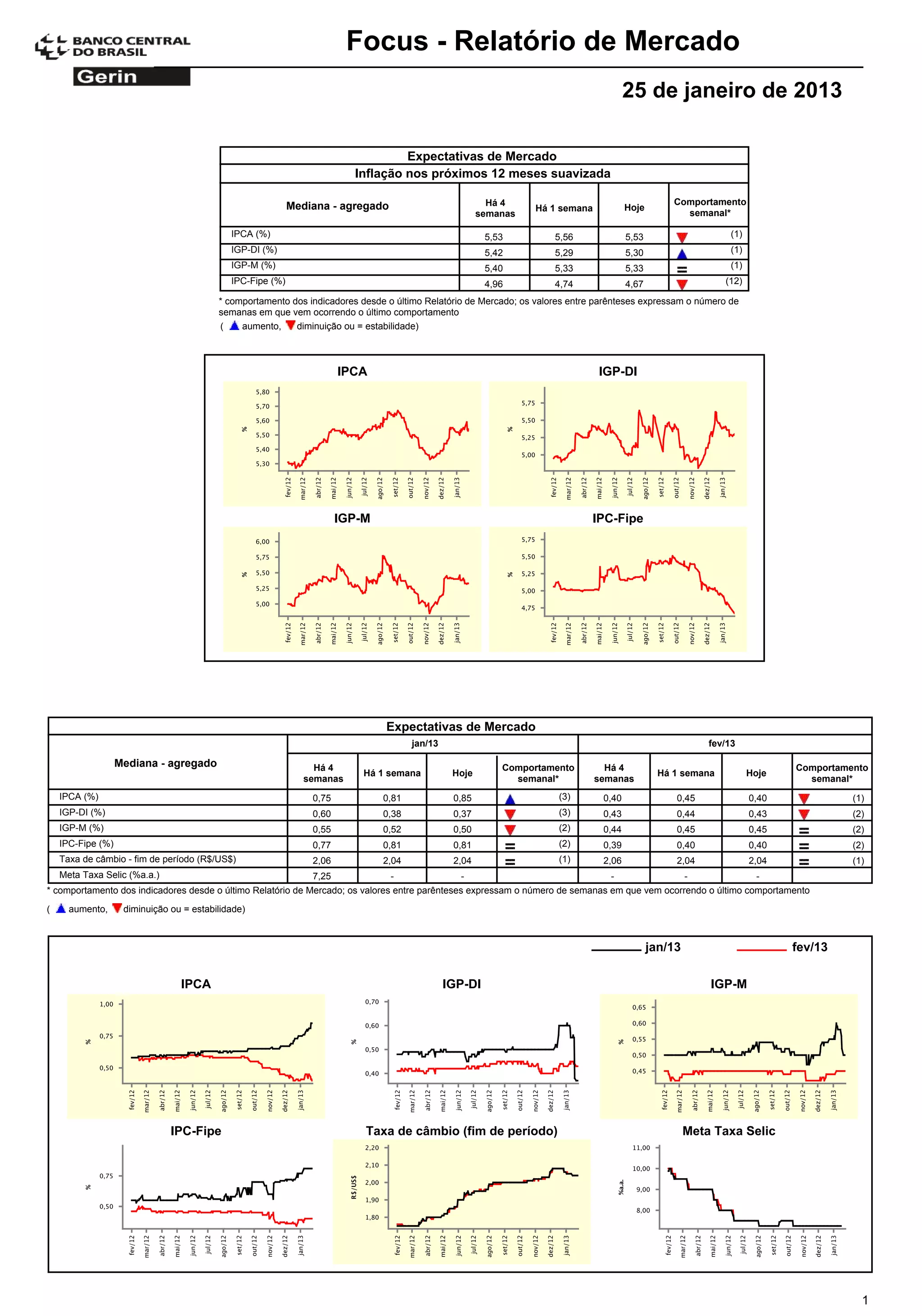 O relatório resume as expectativas de mercado para os principais indicadores econômicos brasileiros nos próximos meses e anos. A inflação mediana esperada é de cerca de 5,5% para 2013 e em torno de 5% para 2014. A taxa de câmbio e a taxa Selic também são previstas para se manterem estáveis.