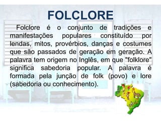 O documento define folclore como o conjunto de tradições e manifestações populares, como lendas, mitos, danças e costumes, que são transmitidos entre gerações. Explica que o folclore representa a cultura popular e é importante para a identidade de um povo. Também lista exemplos de brincadeiras, danças e comidas típicas do folclore brasileiro, assim como autores que usaram elementos do folclore em suas obras literárias.