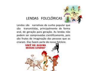 O documento apresenta o folclore brasileiro como um conjunto de mitos e lendas transmitidos de geração em geração, incluindo exemplos como Saci-Pererê e Iara. Destaca a função das lendas e mitos em explicar fenômenos naturais e transmitir valores culturais. Também sugere atividades educativas para explorar o folclore de forma interativa e artística na sala de aula.