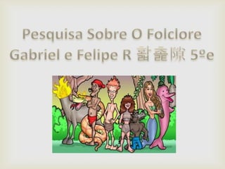 O documento discute o folclore brasileiro, definindo-o como um conjunto de tradições e manifestações populares transmitidas de geração em geração, como lendas, mitos, provérbios, danças e costumes. Ele lista 5 personagens folclóricos, lendas, crendices populares, brincadeiras e ditados comuns no folclore brasileiro.
