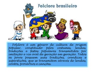 O documento resume diversos aspectos do folclore brasileiro, incluindo lendas, personagens, danças e festividades populares. Algumas lendas mencionadas são a do Boto, Curupira, Iara e Lobisomem. Danças como o samba, capoeira e quadrilha são descritas, assim como festivais como o São João e o rodeio. O folclore é transmitido oralmente e inclui costumes, tradições e superstições de cada região.