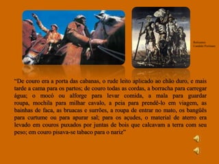 O documento discute diferentes aspectos da cultura popular brasileira, incluindo folclore, lendas, danças, música e personagens folclóricos. Ele fornece exemplos de figuras do folclore como o Saci Pererê, Iara e Curupira, assim como descrições de danças populares como o samba, quadrilha e congado. O documento também menciona lendas brasileiras como a da Cobra Grande e do Boto, além de resumir elementos da cultura do couro no Nordeste e da produção de cordéis.